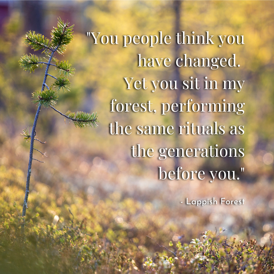 Lappish forest: “Following travellers has always a pleasant pastime for me. You believe you have changed but here you sit in my forest, performing the same rituals as the generations before you. I remember back in the day; Sámi used to measure distances in the number of coffee breaks they took during a journey. You’re all more similar than you think."